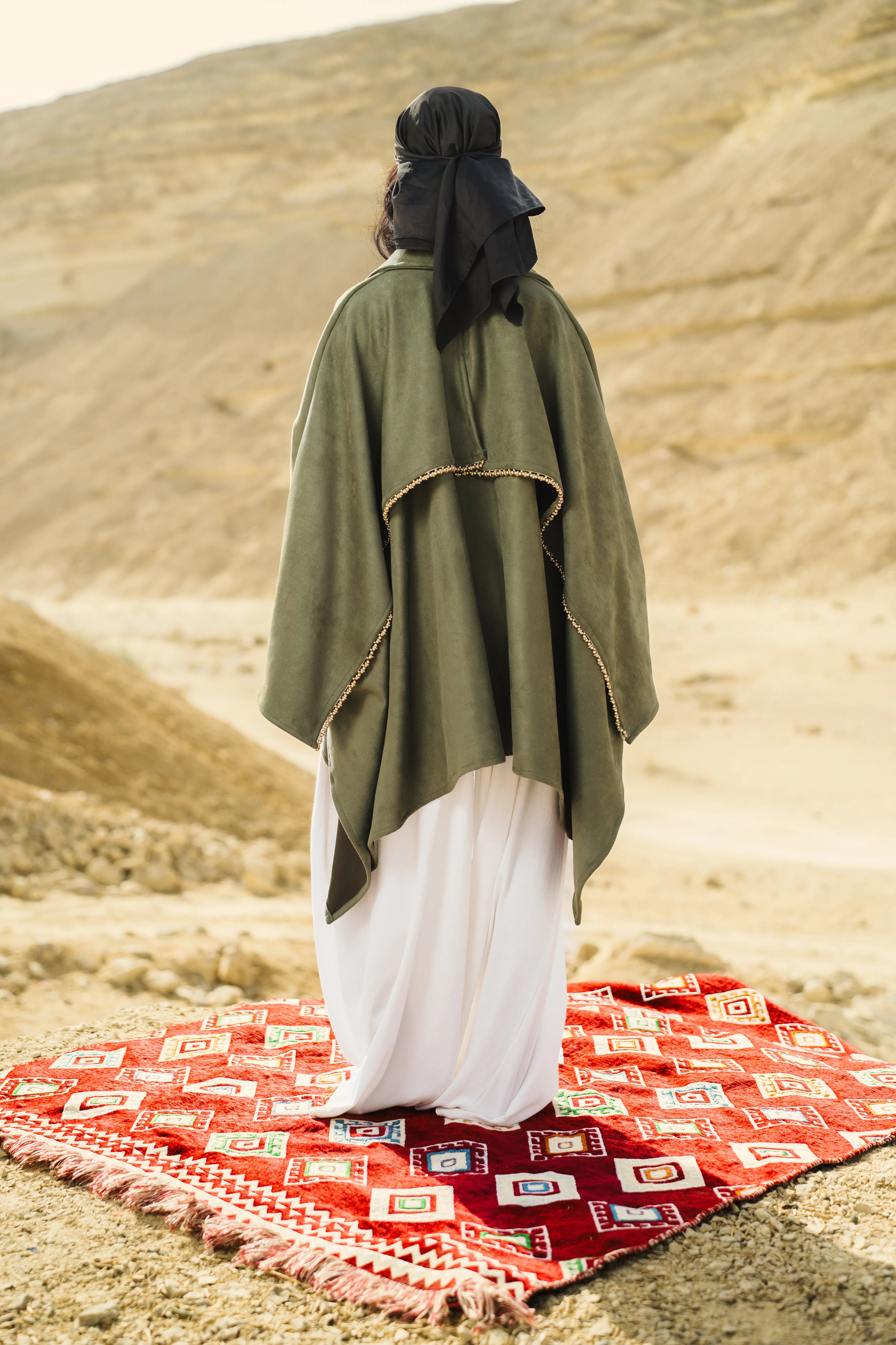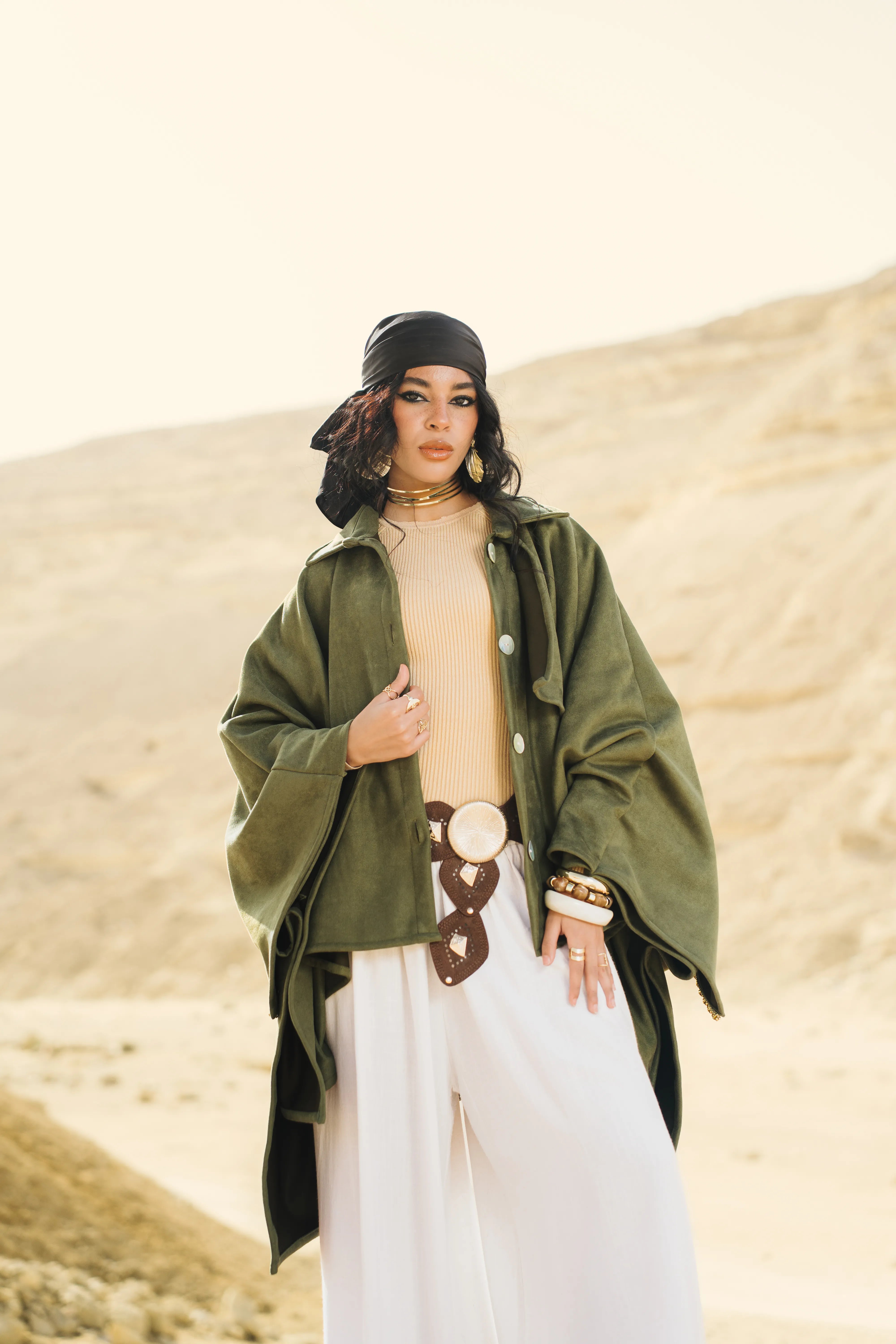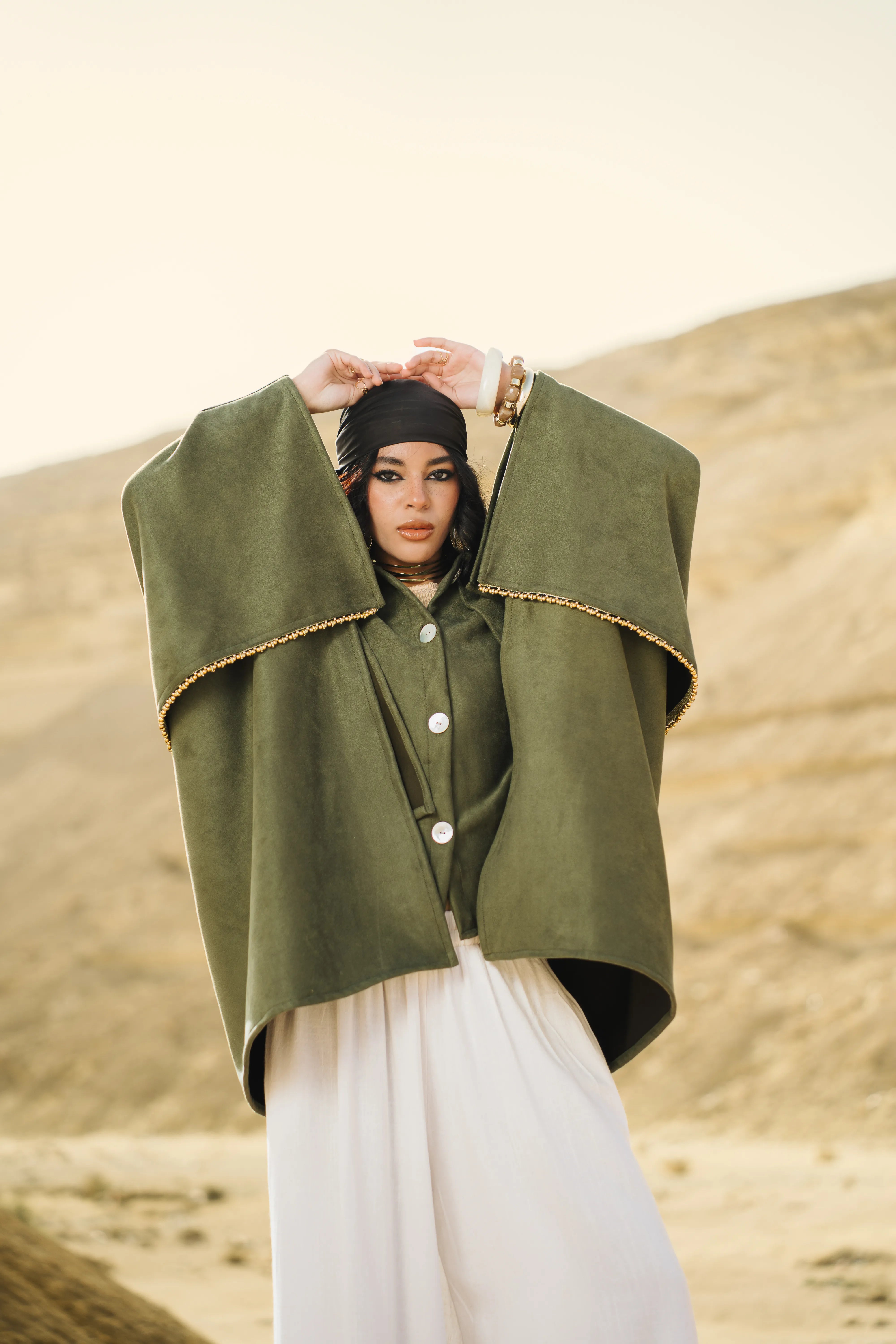 A minimalist cape-style jacket featuring a fluid silhouette, wide sleeves, and refined front buttons, crafted from a soft premium fabric.